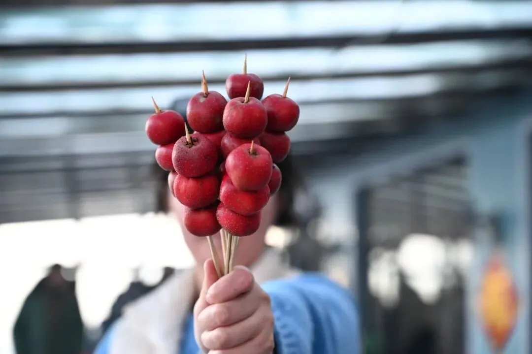 满街都是北方过年的味道,豆腐角、桥头糕、萝卜丝饼、古北烤梨、山楂甜筒。古北味儿的小吃让人直流口水。