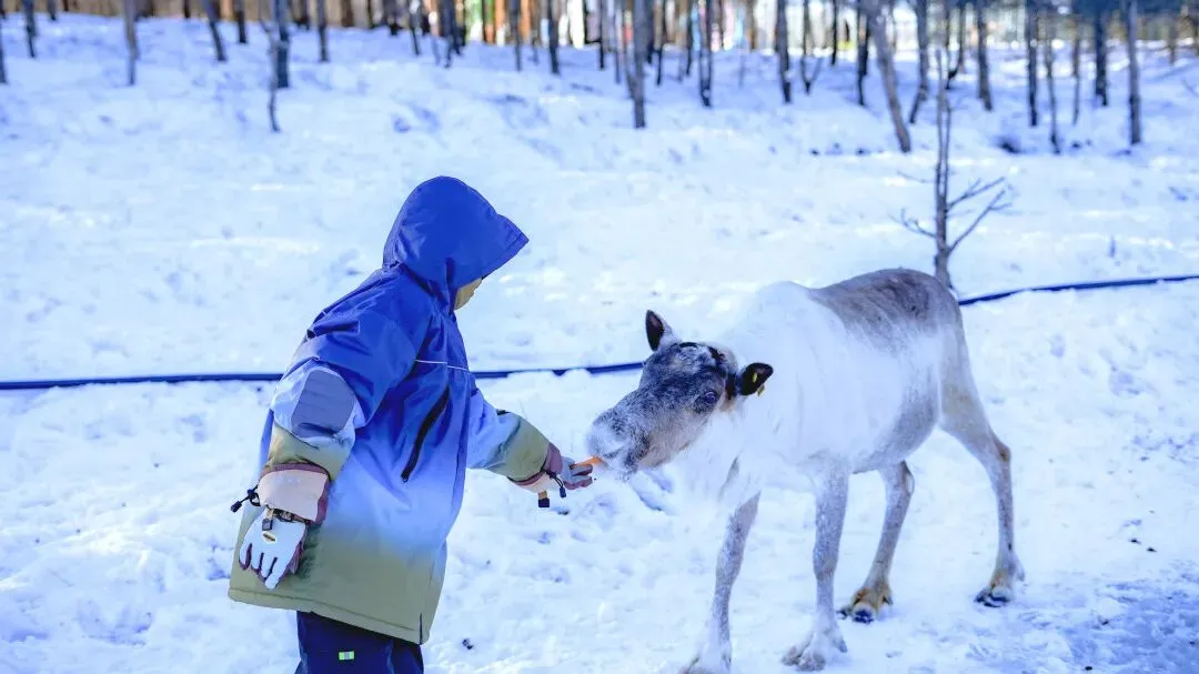 伸出的小手 触碰驯鹿温润的鼻尖