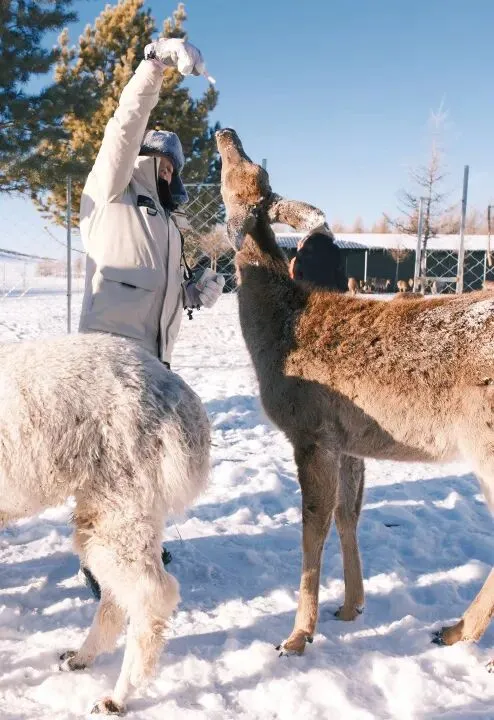 乌兰布统草原 雪原驯鹿 喂食萌宠