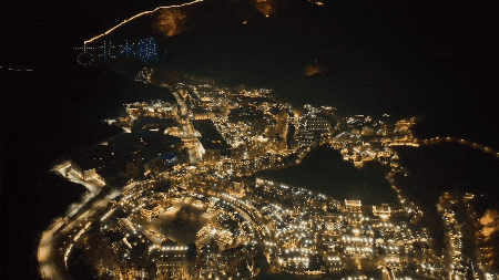 夜幕降临,街巷都灯火通明,酷炫的无人机表演拉开星空的序幕,无人机组成的巨幅新年快乐,让欢乐的气氛达到顶峰。