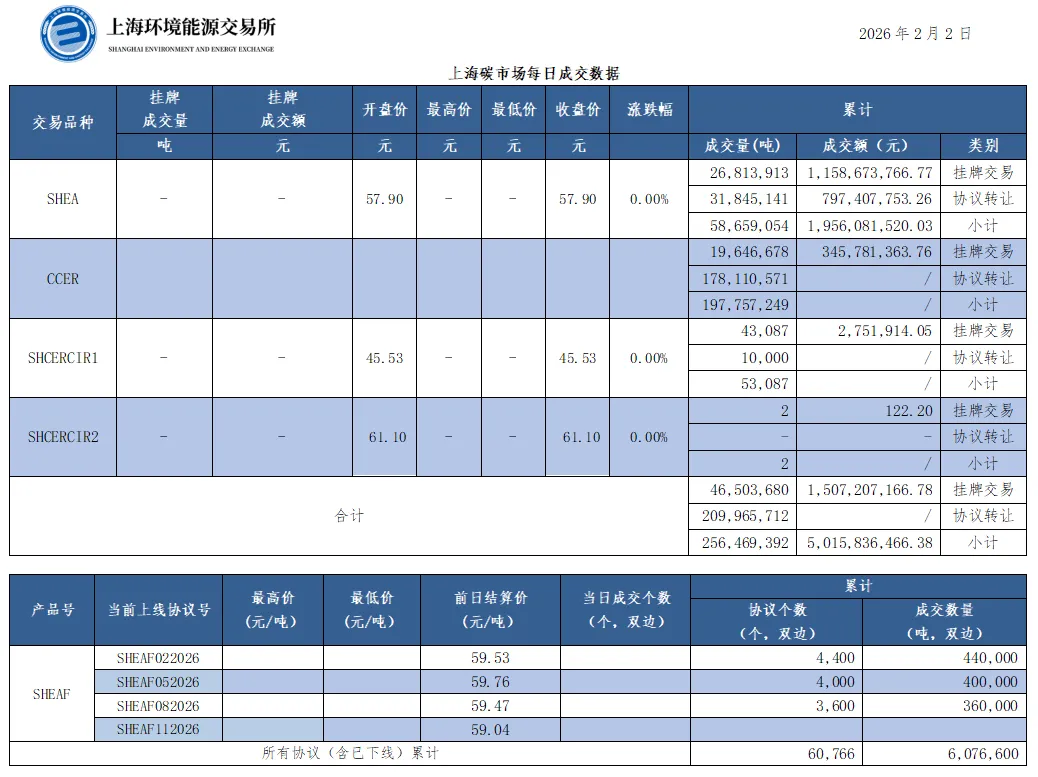 截至今日,上海碳市场所有现货品种累计成交量256,469,392吨,累计成交金额5,015,836,466.38元。其中,配额累计成交58,659,054吨,成交金额1,956,081,520.03元;CCER累计成交197,757,249吨;SHCERCIR1累计成交53,087吨;SHCERCIR2累计成交2吨。上海碳配额远期产品累计成交数量6,076,600吨。