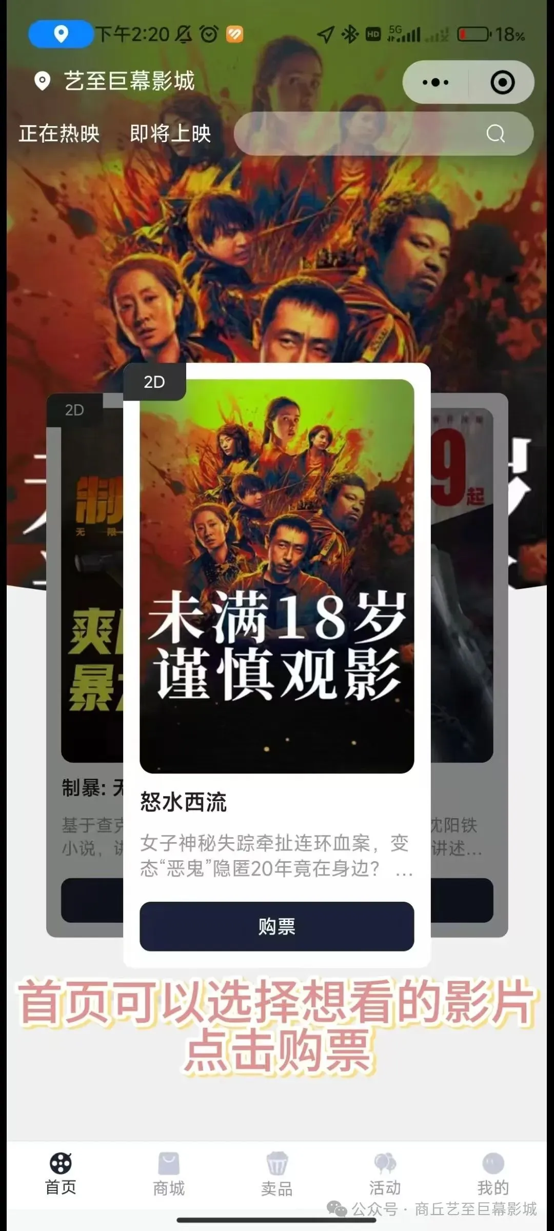 点击公众号左下角在线选座然后点击选座购票即可进入小程序首页,然后选择您想看的影片即可进行购票。
