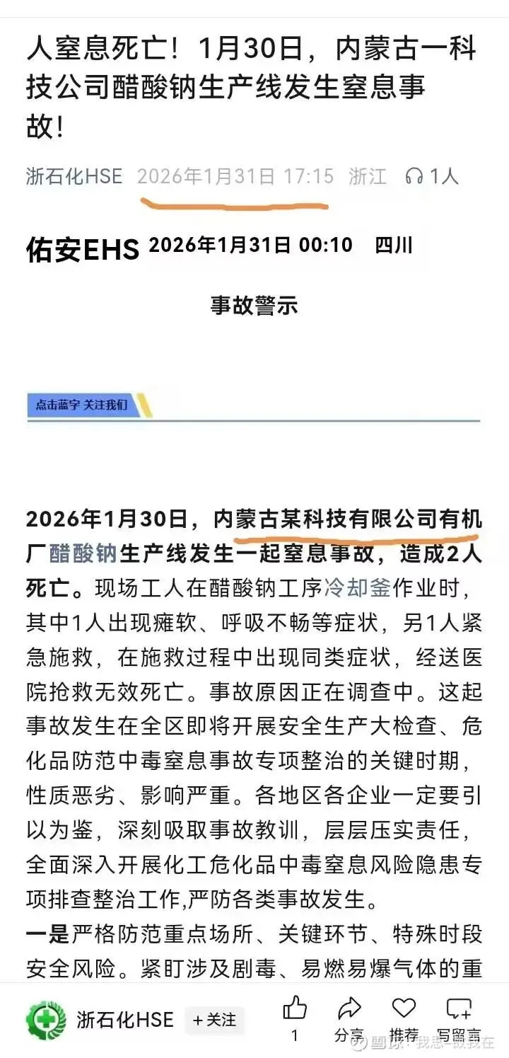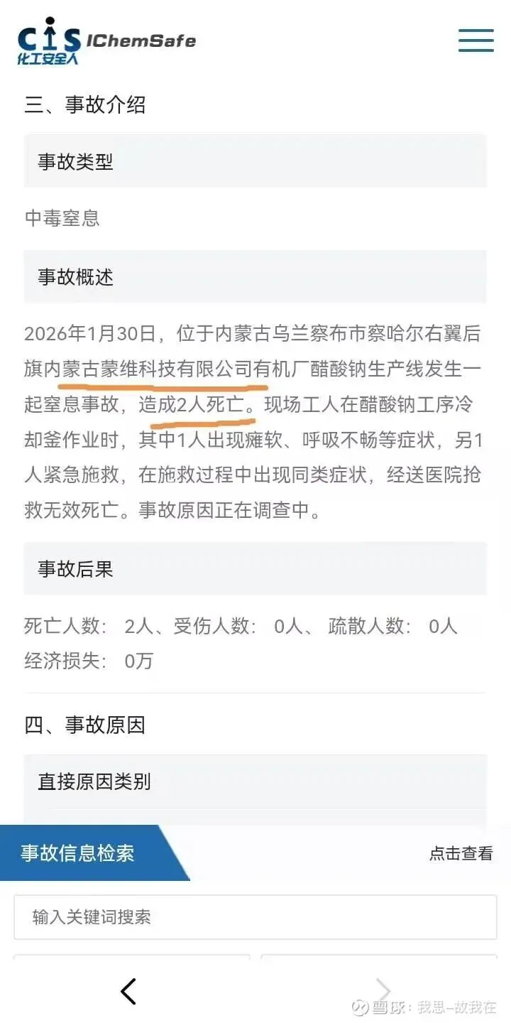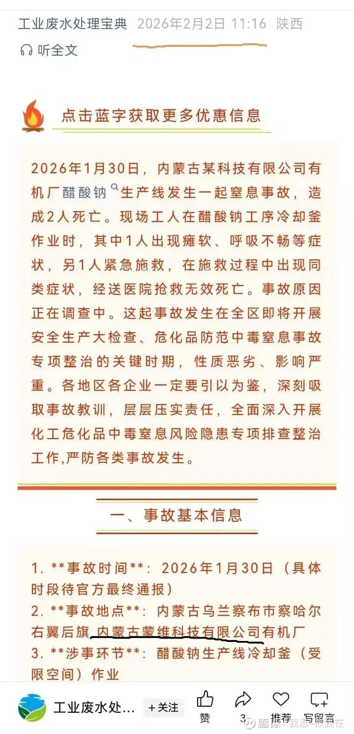 2026年1月30日,内蒙古蒙维科技有限公司有机厂醋酸钠生产线发生一起窒息事故,造成2人死亡。