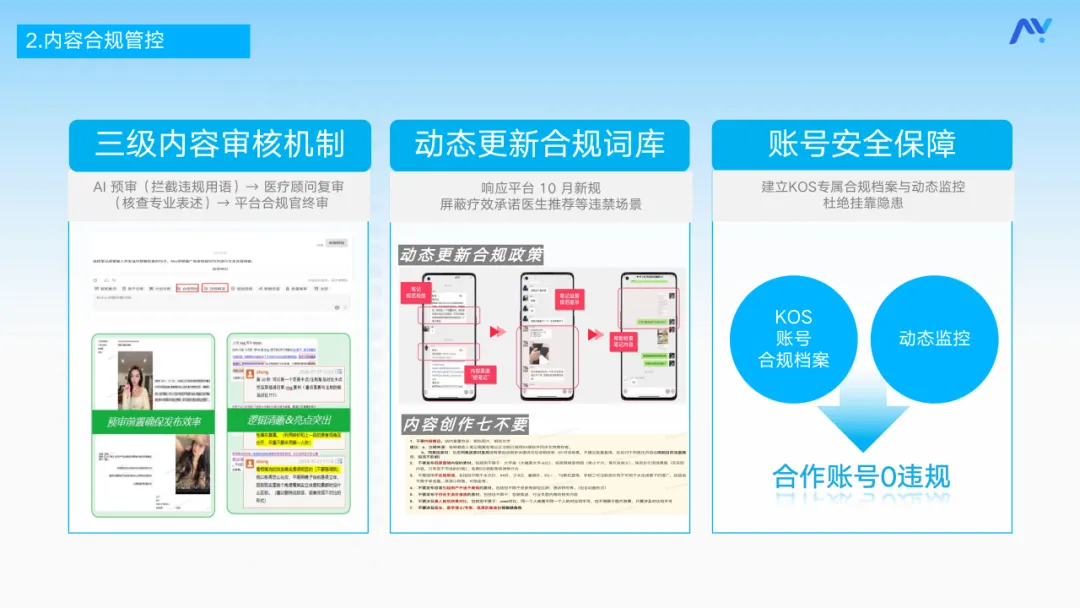 同时,妙言建立了三级审核机制,先由 AI 预审拦截违规用语,再经医疗顾问复审核查专业表述,最后由平台合规官终审;同时动态更新合规词库,响应平台新规,屏蔽疗效承诺、医生推荐等违禁场景。