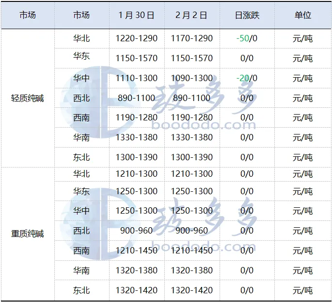 今日国内纯碱市场局部价格下调。当前华北地区轻质纯碱主流价格维持在1170-1290元/吨,重质纯碱价格为1210-1300元/吨;华东地区轻质纯碱价格区间在1150-1570元/吨,重质纯碱主流价格在1250-1300元/吨。供应端,南方碱业纯碱装置停车检修,丰成盐化纯碱装置近日存检修计划;随着春节临近,下游工厂陆续放假,对纯碱的需求有所缩减;部分厂家新单价格下调,节前以出货去库为主。