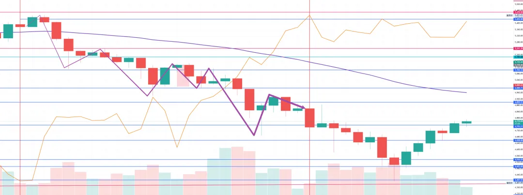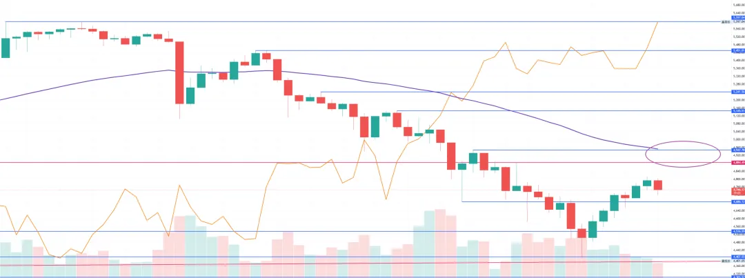 上方新增阻力,主要根据这轮超强跌势中的孕线结构设置,今晚则是重点关注图中紫圈的4948美元阻力和200小时均线的结合区域,能否出现幅度合适的反转看跌信号。