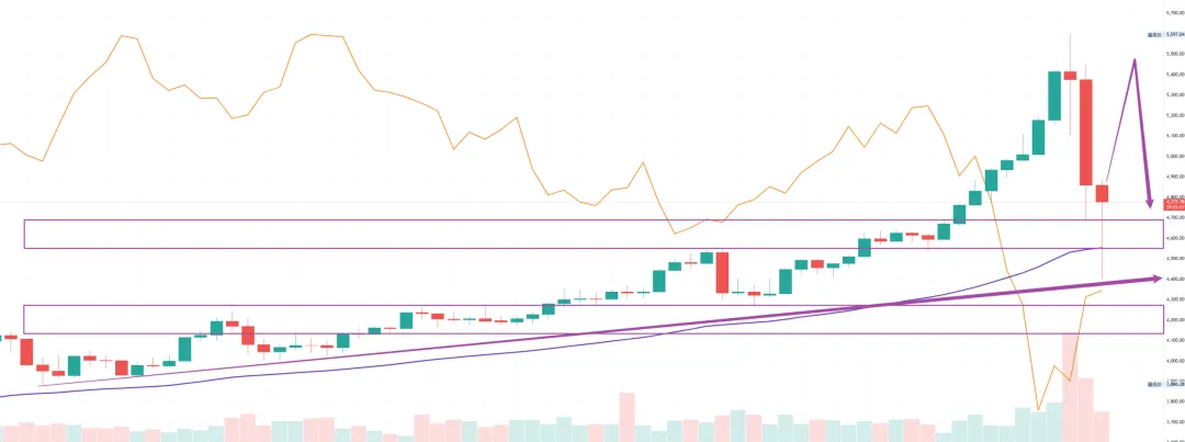 当然,如同周末技术面分析中所述,我们非常期待黄金价格创造第二高点位置的顶部(目前看最佳位置在5450美元附近),这样再下跌破掉今天低点位置后,黄金价格可能就真要回到3000美元级别的区域了。