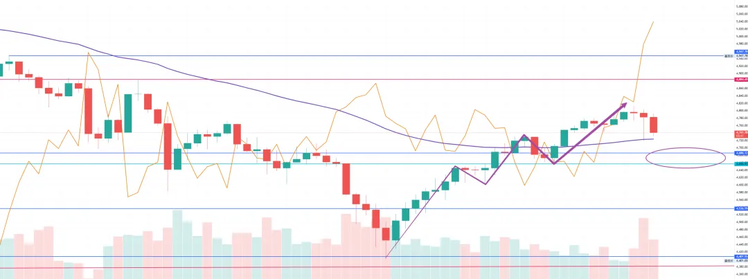 而下方还是重点关注4407.5美元支撑位和前期上涨趋势线的结合区。