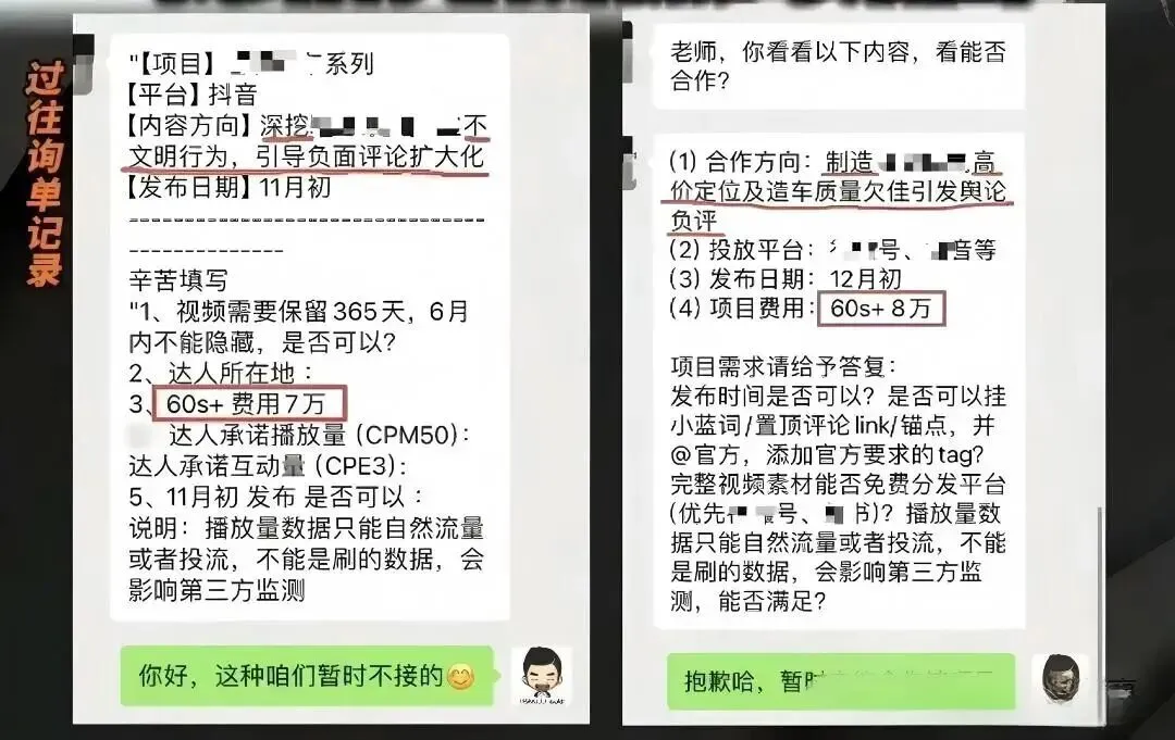 根据汽车大v晒出的聊天截图显示:制造高价定位及造车质量欠佳引发舆论负评,60秒报价8万元,这似乎能对应上去年饱和式攻击小米汽车的舆情事件了。
