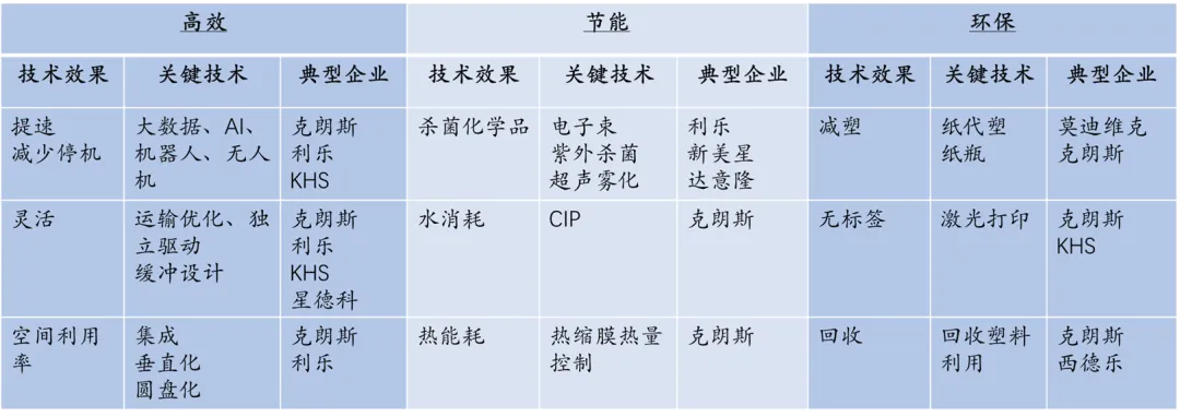 克朗斯、利乐凭借在 AI 与自动化领域的深度投入,持续领跑高效化技术赛道,优势进一步扩大。节能技术聚焦减少化学品消耗、水资源浪费与热能耗,核心突破在杀菌领域:- 电子束、紫外 / UV 杀菌、超声雾化等技术逐步替代传统化学杀菌,降低环保压力;