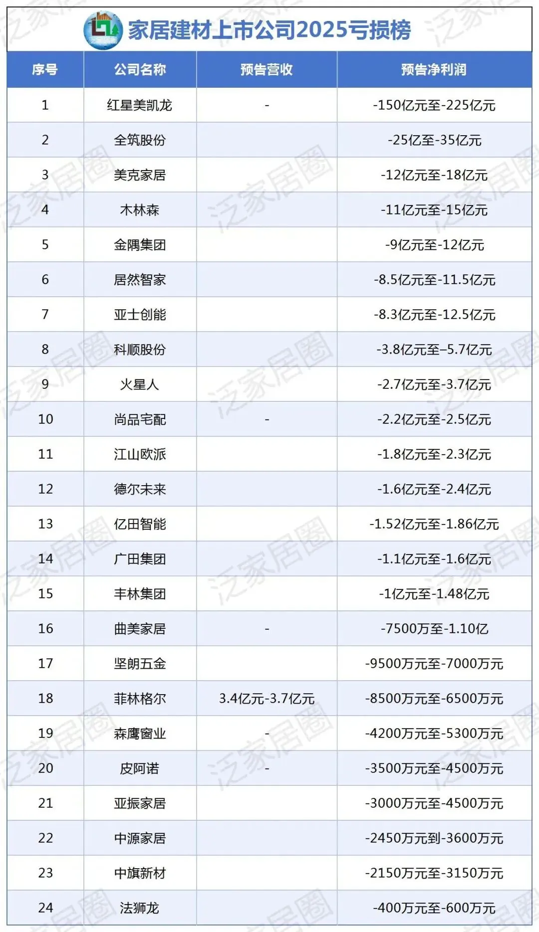 今日,泛家居圈发布的2025家居上市公司亏损最新数据显示如下图: