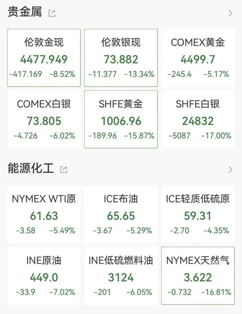 2026年2月的第一个交易日,贵金属继续巨幅波动,现货黄金回落至4480美元/盎司下方,日内跌超8.52%,白银振幅更大,目前跌超13%。