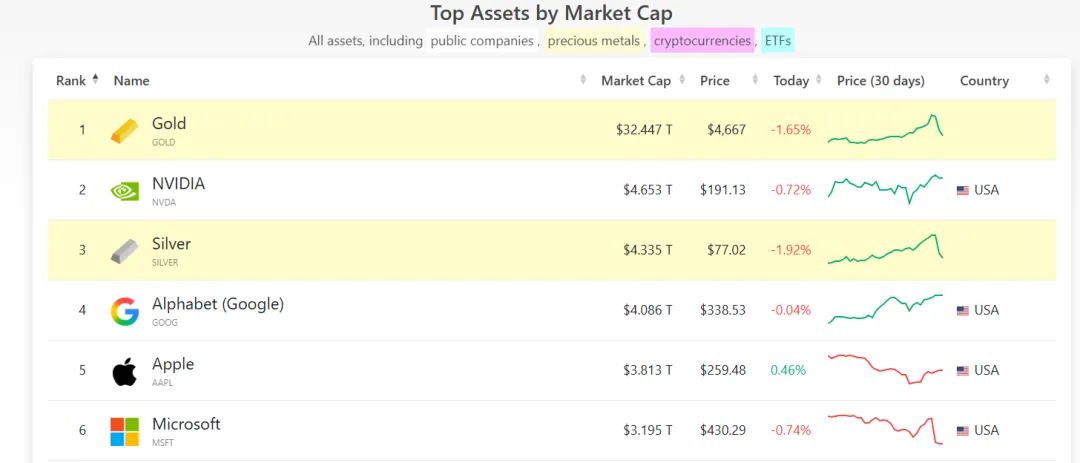Companiesmarketcap数据显示,黄金全球资产市值跌至约32万亿美元,仍排名第一位。白银全球资产市值缩水至约4万亿美元,跌至第三位,仅次于英伟达4.653万亿美元的总市值。