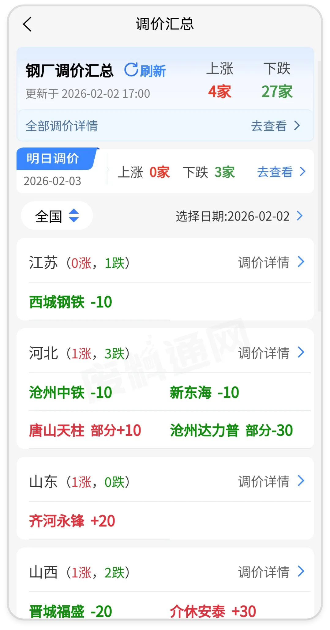 2月3日00:00时起江苏【徐州金虹】钢铁所有料型价格统一下调20元。最新价:剪切料一级2090,剪切料二级2030,钢刨花一级2120,钢刨花二级2110,数控一级2090,数控二级2080,普通屑一级2050,普通屑二级2040,原厂纯净压块2090,油屑压饼2050,长丝(原厂)2020