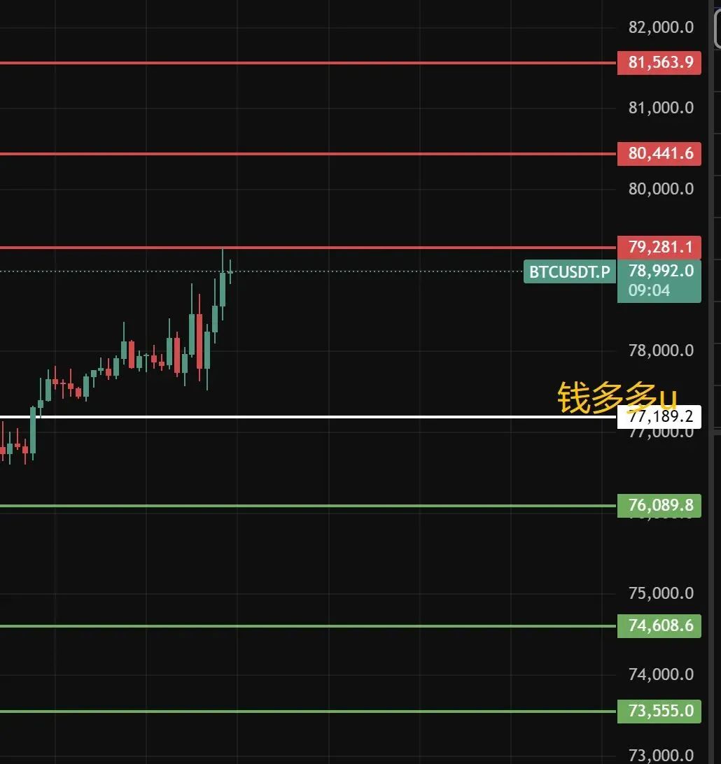 充值信仰该充值的时候充值!可是行情不能一直涨噢~多中有空!空中有多~大饼夜间跌破77188,小时级别反弹走弱!#BTC走势分析 继续回踩76000短多,稳健等74600!止损1500刀!站稳79000上方!反弹力度才大一点!目标压力80500/81566-