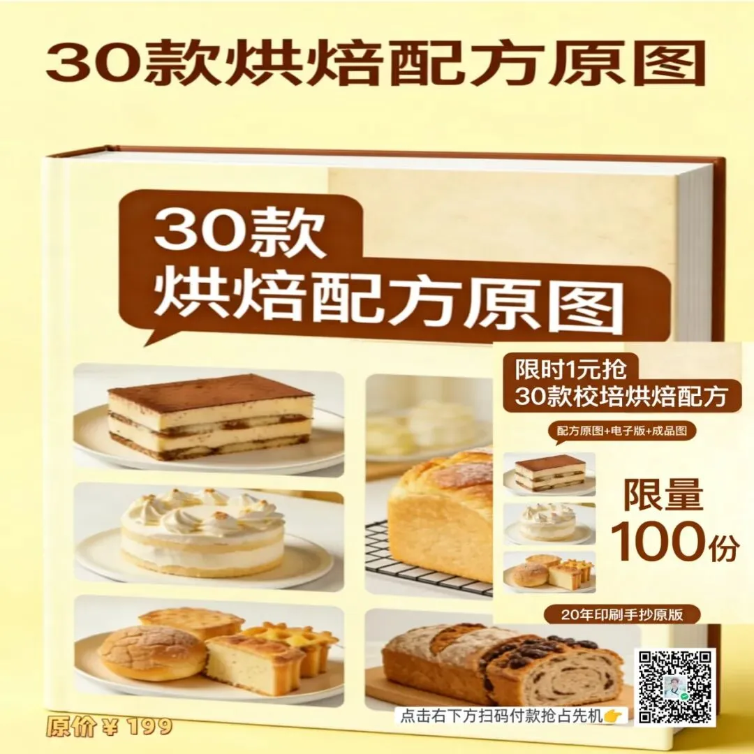 △我的首本电子书↓《30款烘焙配方原图》限时限量1元,无论是宝妈的你还是学生期的你,想学习一门技能来创业、就业,还是想做副业…学校母版培训配方是你明智的选择,扫描二维码付款优先抢购买!我28年前进入烘焙行业,线下守着一家很普通、很传统的社区蛋糕店,安安静静的,今年第10个年头了。