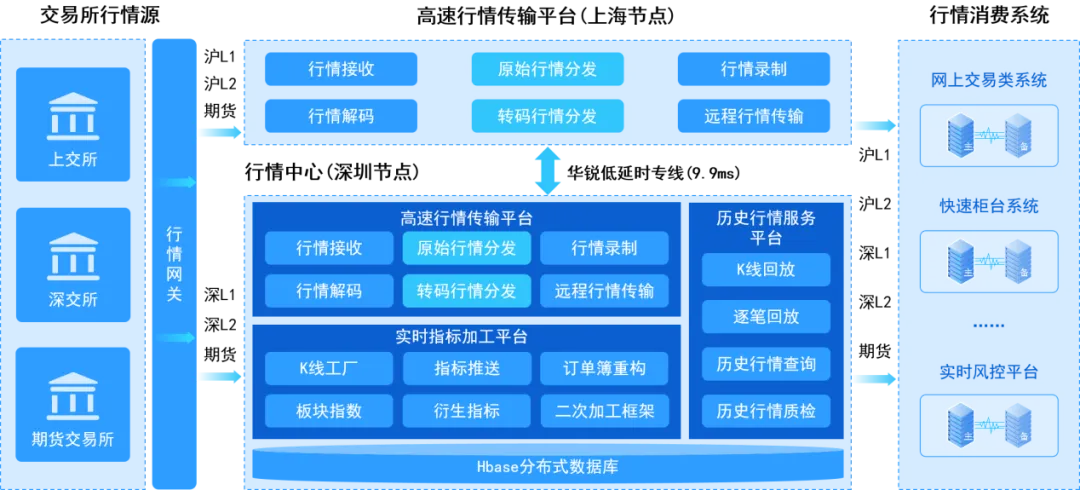 在此背景下,近几年国内行情的使用也从入门级Level 1行情,逐步普及到包含逐笔、刷新频次更高的Level 2行情,投资者对时延的要求从毫秒级提升至微秒级,甚至纳秒级。面对白热化的市场竞争,行业从基础行情迈向衍生加工行情,开始探索提供个性化的服务。安信证券作为行业领先券商,不仅在机构交易、两融等业务上投入了大量的资源予以支持,在行情服务能力构建上也有长远的布局和规划,力求不断突破,打造全面、极致的行情服务平台。几年前,安信证券原有的行情系统仍是单体架构,系统虽然可以满足基本的行情分发需求,却由于技术框架限制无法突破数据传输的性能瓶颈。历史行情存储及衍生指标加工分散在各独立系统中,无法共享,未能构建起统一、高效、便利的服务能力。面对上述问题,安信不断寻求更先进的解决方案,希望可以通过构建统一开放的行情中心,提供不同层次的行情分发能力。新方案应具备实时高速分发、衍生行情加工、历史行情服务等功能,能满足投资者交易、投研等各种行情消费场景需求。安信证券构建企业级低时延行情中心的想法,与华锐金融技术分布式、开放、平台化的理念不谋而合,双方早在2017年就开始在行情领域展开深度合作。2018年,华锐高速行情平台AMD2.0在安信上线,满足了Level 1低时延行情分发服务需求,Level 1行情系统在低时延和稳定性方面有了显著提升;2020年5月,高速行情平台升级到AMD3.0,提供原始行情(DMDC)、转码行情(AMA)等多种对接形式的服务能力,很好地满足了量化客户极速Level 2行情转码分发的业务需求;2020年12月,安信上线了行业内首个新一代分布式行情中心AMD4.0,至此,安信新一代行情中心具备了极速行情分发、实时衍生加工、历史行情服务的全方位能力。安信行情中心由高速行情传输、实时衍生加工、历史行情服务三大平台组成:该平台结合先进基础设施加速技术,具备超低时延、高可用、水平扩展、易对接等特点,提供多模式的行情分发服务,为实时行情加工打下了坚实的基础。▎实时衍生加工平台——微秒级加工、指标全面,个性化定制该平台在高速行情传输平台基础上,通过横向扩展衍生加工模块组成,提供K线、板块指数等通用指标加工服务。同时,平台提供二次开发框架,满足业务部门和客户个性化指标加工需求,为客户提供微秒级的指标加工服务。该平台实现了实时行情及衍生加工指标的数据持久化,并通过Http、WebSocket等接入方式为下游系统提供各种历史行情数据服务。