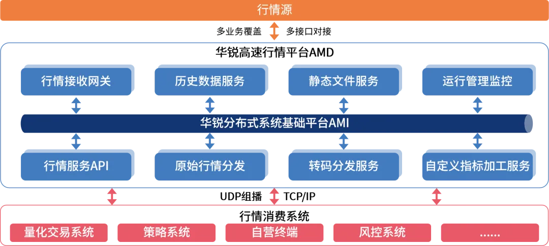 华锐极速行情系统AMD是基于华锐分布式基础技术平台AMI打造的平台级产品,具备低时延、高吞吐、高可用、易扩展等特性,同时提供开放的高性能开发框架,便于客户根据需求构建不同的行情解决方案,为投资者提供多层次的行情服务。• 分布式架构、技术先进