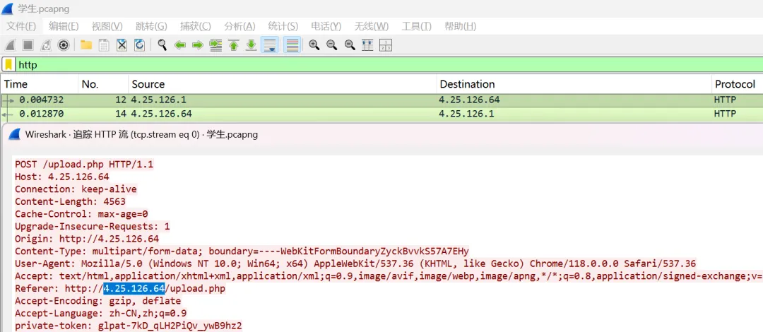 某高校门禁管理系统疑似被入侵,部分师生进出某实验室的数据疑似被盗取,并被上传至攻击者计算机,请对学校审计系统记录的流量数据进行分析,溯源攻击者。