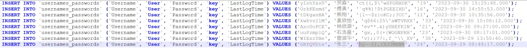 压缩包解压后获取攻击者盗取的plain.sql数据库文件,对plain.sql文件中的部分秘文进行解密,获取用户张三的门禁密码的明文,其中用户名字段为user,门禁密码采用某古典加密方式加密、字段为password