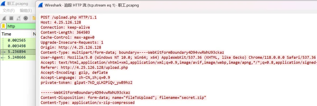 某单位视图库系统被攻击,员工张三的个人数据疑似被攻击者盗取,并被上传至攻击者计算机,请对审计系统记录的流量数据进行分析,溯源攻击者。