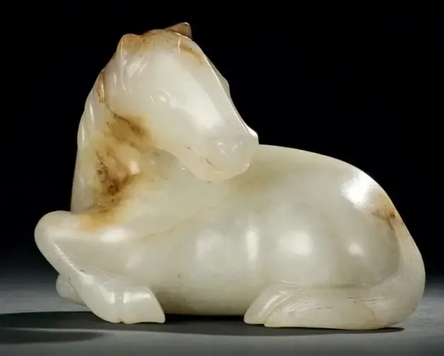 白玉质,细腻温润。立体圆雕一卧马,睁眼闭口,神情温驯松驰,四蹄曲于身下,左前肢微抬半立,身躯壮硕,肌肉强健有力,比例协调。长尾后弯,修长轻巧,颈部鬃毛浓密整齐,分梳两侧,沁色散布于马头顶、胸前及后臀上,宛如毛色斑驳,独具匠心,刀法简练而传神,灵动而富有神韵,形神兼备,刻画精道,赏玩俱佳。