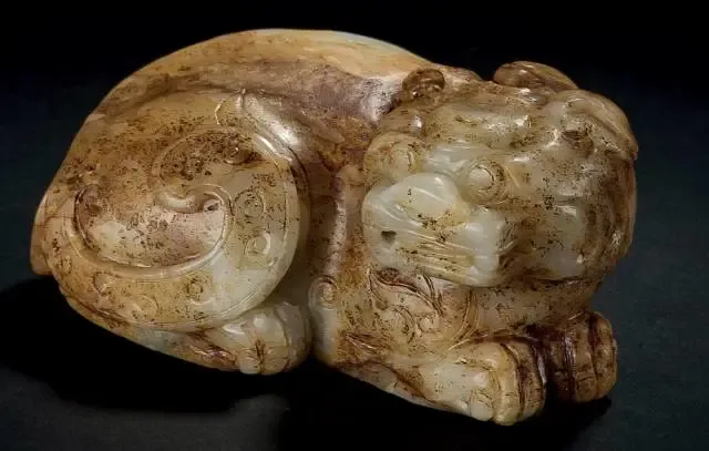 白玉,局部有黄褐色沁。瑞兽作趴卧之姿,立体圆雕而成,形似虎。兽首作圆方形,转向身侧微仰,口微张,双唇以阴线挤阳的手法雕刻,唇内露出双排齿牙,并微露阔舌;如意大鼻,双眼硕大,眼球凸出,眼神向上,双耳贴头,首生独角。四肢以高浮雕塑形,在四肢肱骨处有贴体浮雕的云气。身侧深刻四道肋痕,背部有突起的波浪式脊骨,并沿其两侧斜刀线刻一组纹饰,以示毛发。尾作内卷,贴于臀部一侧。此瑞兽造型古朴、可爱,琢玉精致,通体隐起,颇有生气。