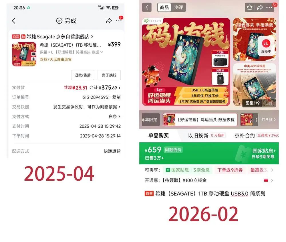前几天和公司会修电脑的同事聊天,聊到电脑周边。同事告诉我,“现在硬盘涨价了”,我查了一下25年4月份买的一个移动硬盘,当时花了300多买了个1T的希捷移动硬盘,现在点进去看同一个链接1T的要600多,涨了将近1倍。这价格涨疯了吧!