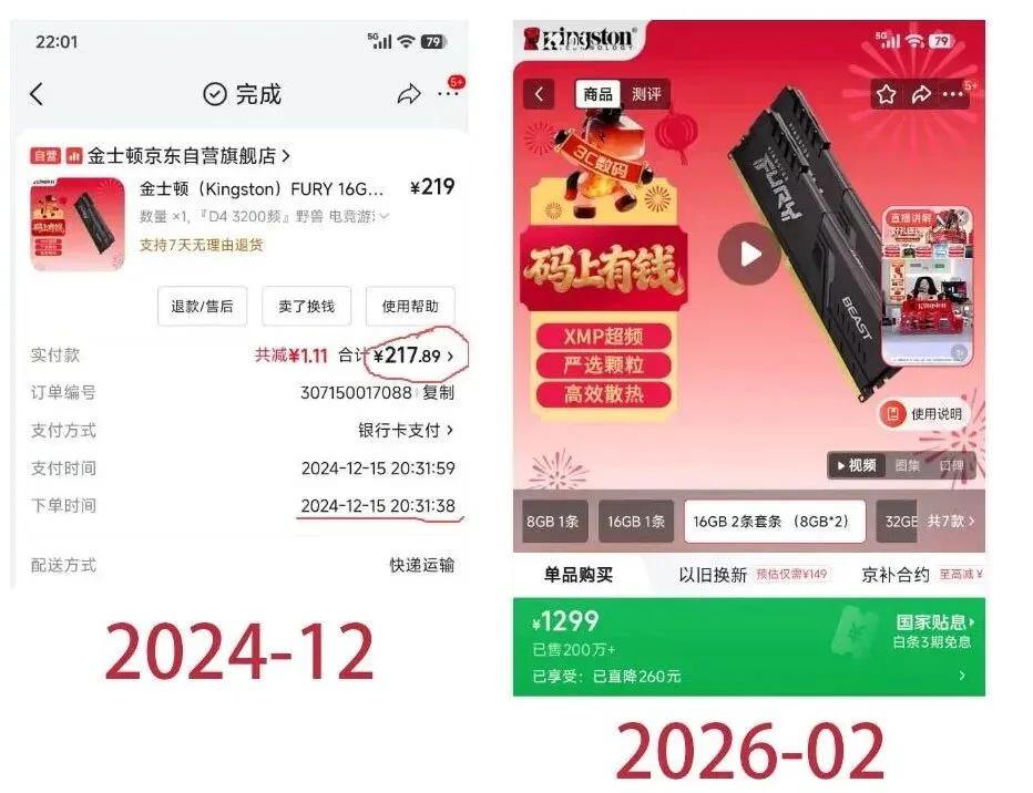 同样的,我在24年12月的时候买过2条8G的内存条,当时我花了不到220元,时隔1年多,涨到1299???涨这么多。