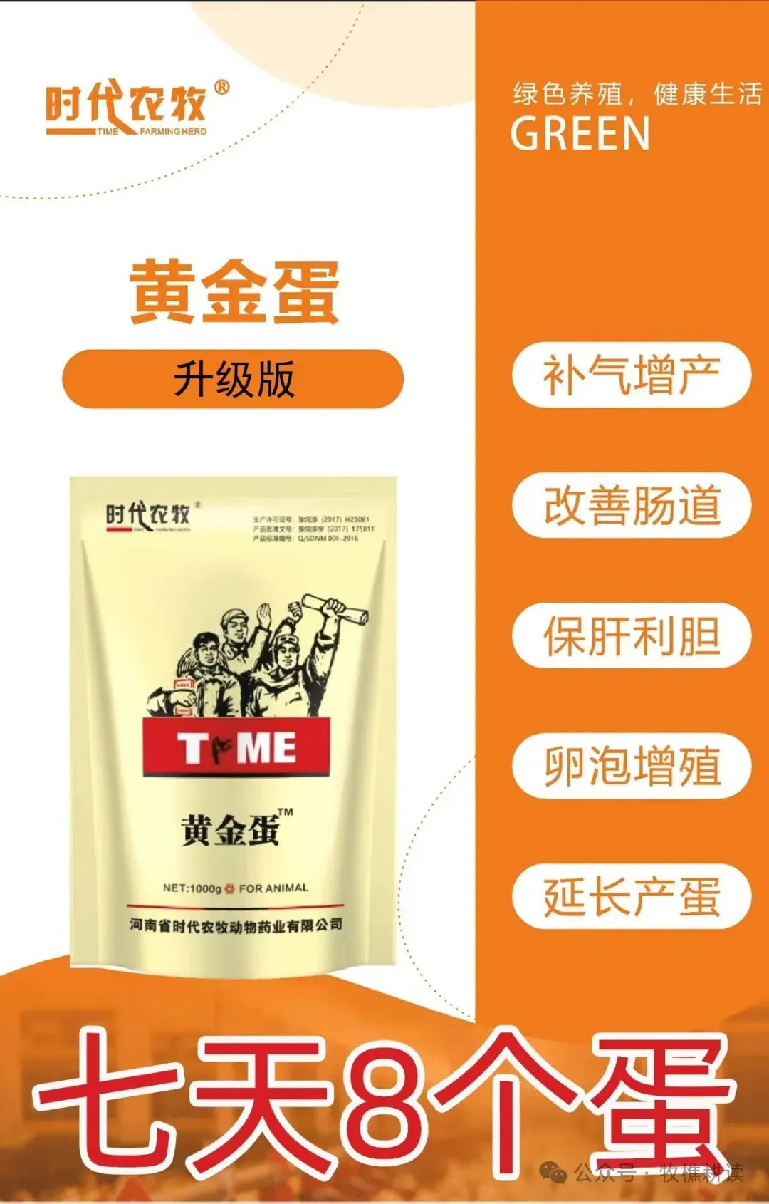 二、黄金蛋蛋禽专用-产品特点: 产蛋率上升,延长产蛋高峰,蛋黄增色,蛋壳厚度增加,提高蛋重,老鸡产蛋回升。可短时间内提高蛋禽产蛋率,增加蛋清粘稠度,蛋黄圆整,蛋清双层,蛋清细嫩;开胃消食,保肝护胆,提高机体免疫力;补充产蛋所需的多种元素,提高生殖系统健康状况,对产蛋下降、无精蛋、死胚蛋等有特效;能延长和维持产蛋高峰期,增加蛋重,改善蛋品质,减少无精蛋、死胚蛋;对各种环境应激引起的产蛋下降有恢复作用;防治产蛋疲劳综合症和减蛋综合症。