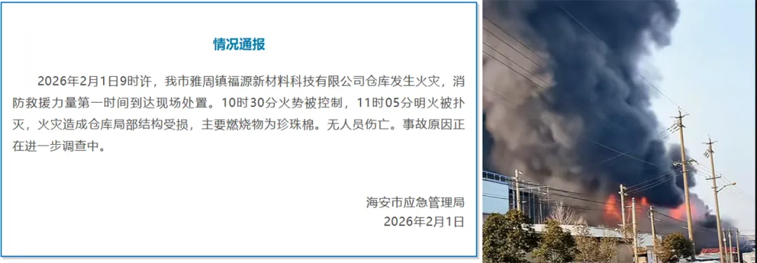 ▶江苏一新材料企业突发火灾事故:12月1日,南通海安市应急管理局发布情况通报称,当日9时许,该市雅周镇福源新材料科技有限公司仓库发生火灾,消防救援力量第一时间到达现场处置。