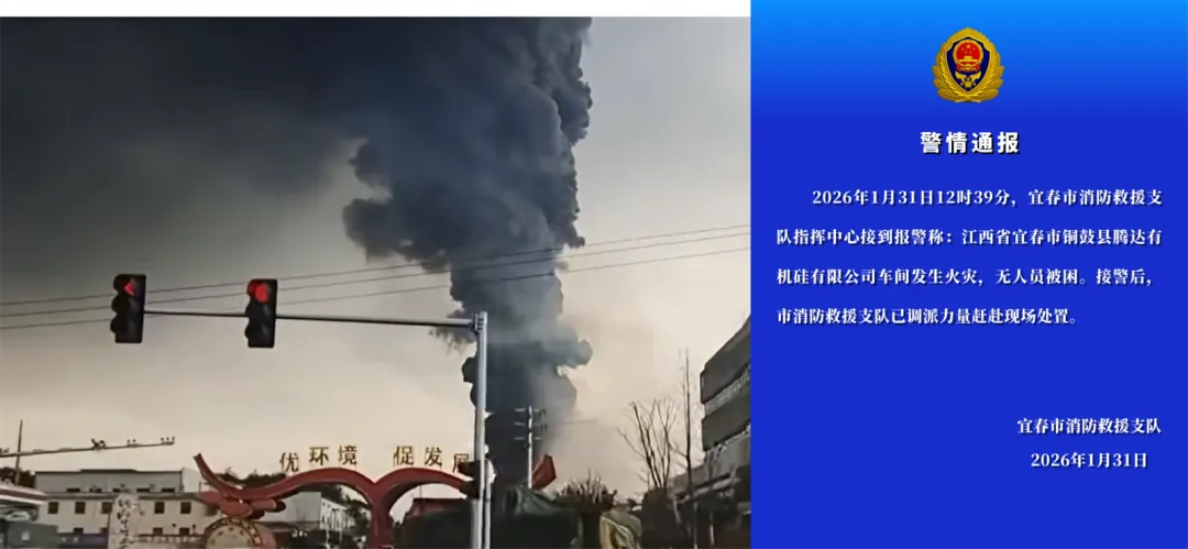 当日下午,宜春市消防支队发布警情通报:2026年1月31日12时39分,江西省宜春市消防救援支队指挥中心接到报警称:江西省宜春市铜鼓县腾达有机硅有限公司车间发生火灾,无人员被困。接警后,宜春市消防救援支队已调派力量赶赴现场处置。