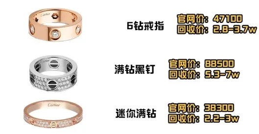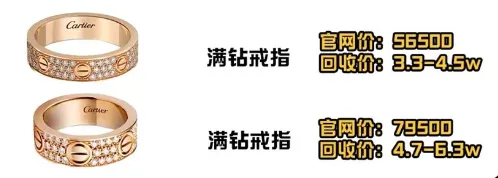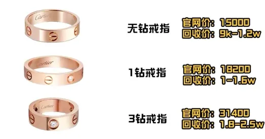 卡地亚戒指回收价格和戒指的款式、材质相关。LOVE系列的戒指最为保值,一般回收价格在原价的6—8折左右,带钻款比不带钻款的回收价格高。