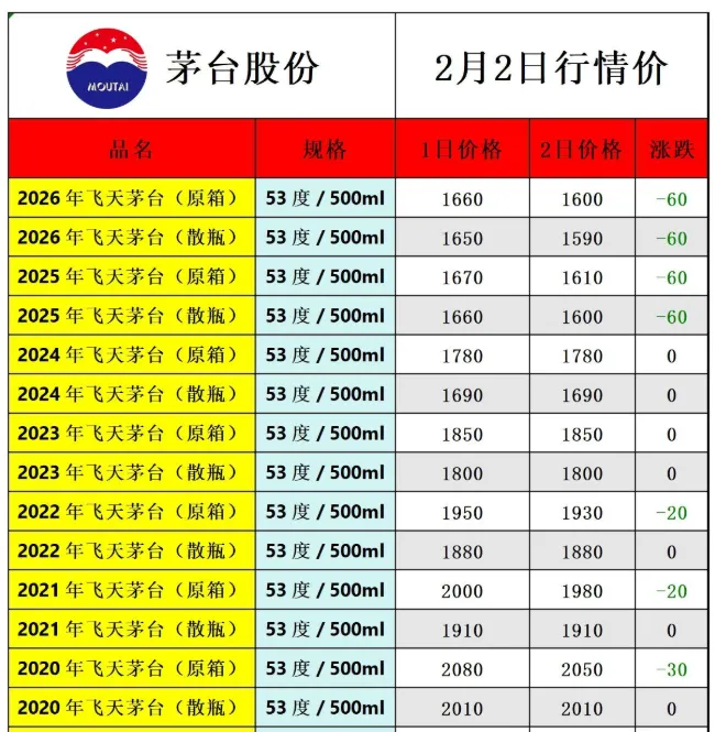 飞天大跌,茅台酒2月2日行情