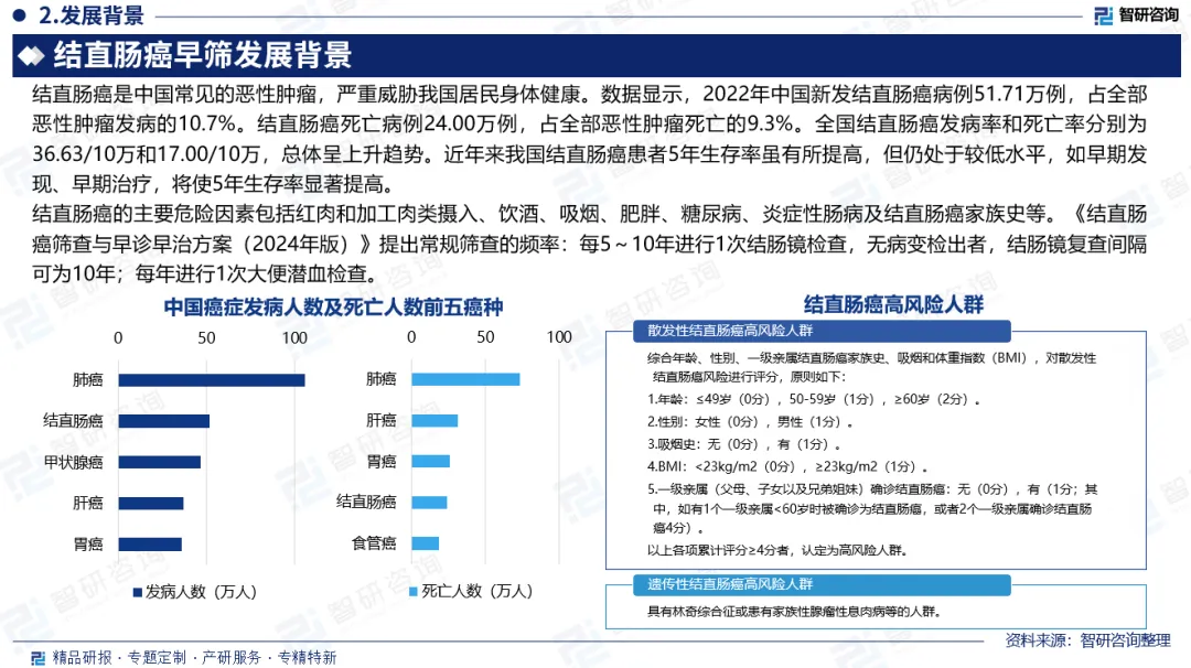发展背景:结直肠癌是中国常见的恶性肿瘤,严重威胁我国居民身体健康。数据显示,2022年中国新发结直肠癌病例51.71万例,占全部恶性肿瘤发病的10.7%。结直肠癌死亡病例24.00万例,占全部恶性肿瘤死亡的9.3%。全国结直肠癌发病率和死亡率分别为36.63/10万和17.00/10万,总体呈上升趋势。
