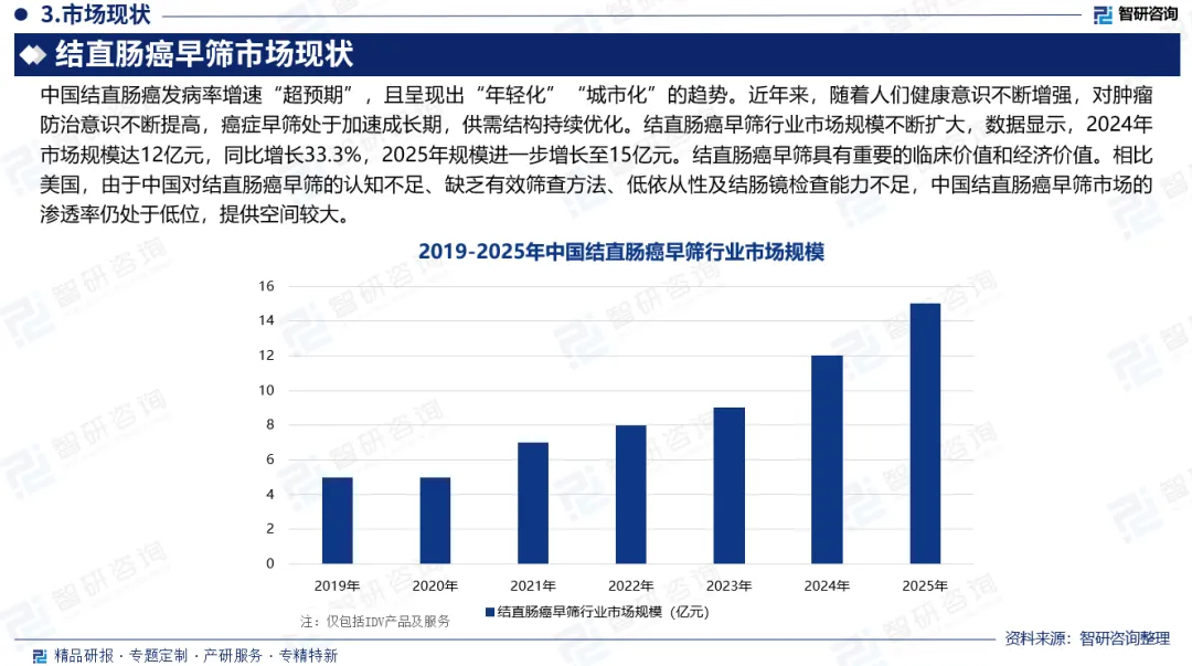 市场规模:近年来,随着人们健康意识不断增强,对肿瘤防治意识不断提高,癌症早筛处于加速成长期,供需结构持续优化。结直肠癌早筛行业市场规模不断扩大,数据显示,2024年市场规模达12亿元,同比增长33.3%,2025年规模进一步增长至15亿元。