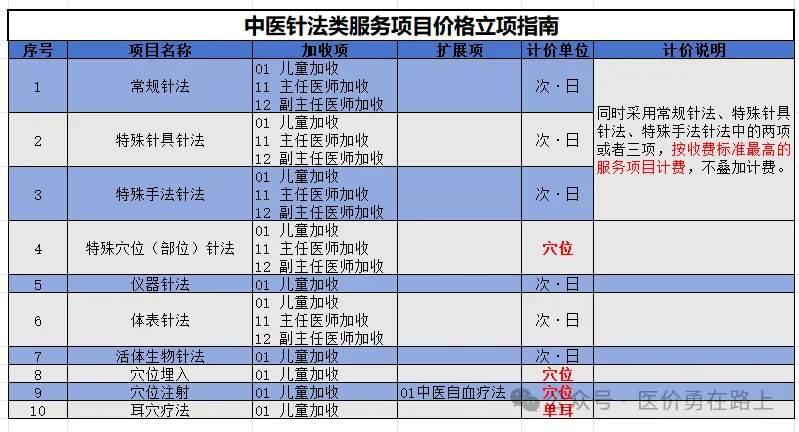 答:医疗机构可在收取“常规针法”或“特殊针法”费用的基础上(次·日),按穴位收取“特殊穴位针法”(穴位)。