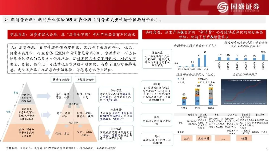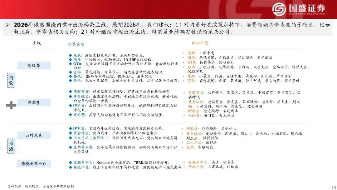 已展现价增潜力的子板块,关注量的修复酒店:休闲需求强劲,供给结构优化,价格持平微增。推荐华住集团-S、锦江酒店、首旅酒店、君亭酒店。免税:海南封关,政策加持,数据企稳,中免份额提升。推荐中国中免,关注王府井黄金珠宝:金价高位震荡,关注终端动销。推荐潮宏基、老铺黄金、周大福,关注菜百股份、老凤祥、周大生、六福集团、周生生、豫园股份母婴:龙头同店稳健增长,政策积极出台。关注孩子王、爱婴室、圣贝拉