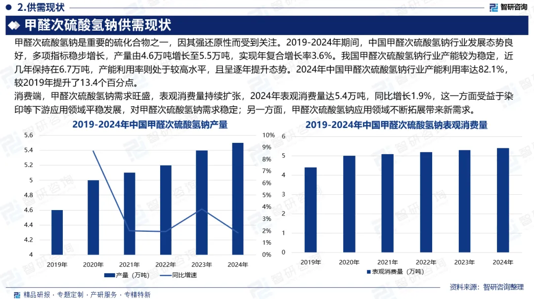 甲醛次硫酸氢钠,又称吊白块、雕白粉,分子式为NaHSO2·CH2O·2H2O,以福尔马林(甲醛水溶液)结合亚硫酸氢钠再还原制得,性状为白色块状或结晶性粉末状,无嗅或略有韭菜气味,易溶于水。吊白块有漂白的作用,通常应用于印染工业,用作拔染剂和还原剂,生产靛蓝染料、还原染料等。此外,还用作橡胶工业丁苯橡胶聚合活化剂;感光照相材料相助剂;日用工业漂白剂以及用于医药工业等。我国规定吊白块严禁用于食品添加。甲醛次硫酸氢钠是重要的硫化合物之一,因其强还原性而受到关注。2019-2024年期间,中国甲醛次硫酸氢钠行业发展态势良好,多项指标稳步增长,产量由4.6万吨增长至5.5万吨,实现年复合增长率3.6%。我国甲醛次硫酸氢钠行业产能较为稳定,近几年保持在6.7万吨,产能利用率则处于较高水平,且呈逐年提升态势。2024年中国甲醛次硫酸氢钠行业产能利用率达82.1%,较2019年提升了13.4个百分点。甲醛次硫酸氢钠需求旺盛,表观消费量持续扩张,2024年表观消费量达5.4万吨,同比增长1.9%,这一方面受益于染印等下游应用领域平稳发展,对甲醛次硫酸氢钠需求稳定;另一方面,甲醛次硫酸氢钠应用领域不断拓展带来新需求。中国甲醛次硫酸氢钠进出口数量呈波动态势,2020-2022年出口数量维持在1万吨,2023年增长至2万吨,2024年为1.8万吨,进口数量则在0.9-1.2万吨之间波动,2024年为1.2万吨。目前,中国甲醛次硫酸氢钠行业内企业较多,包括无锡市宝丽鑫化工贸易有限公司、杭州绿晨生物科技有限公司、江苏勃仑化学有限公司、山东宇硕化工有限公司、安徽晶科新材料科技有限公司,以中小企业为主,市场竞争激烈,行业尚未形成绝对龙头企业。