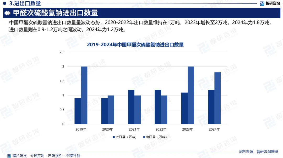 进出口数量:中国甲醛次硫酸氢钠进出口数量呈波动态势,2020-2022年出口数量维持在1万吨,2023年增长至2万吨,2024年为1.8万吨,进口数量则在0.9-1.2万吨之间波动,2024年为1.2万吨。