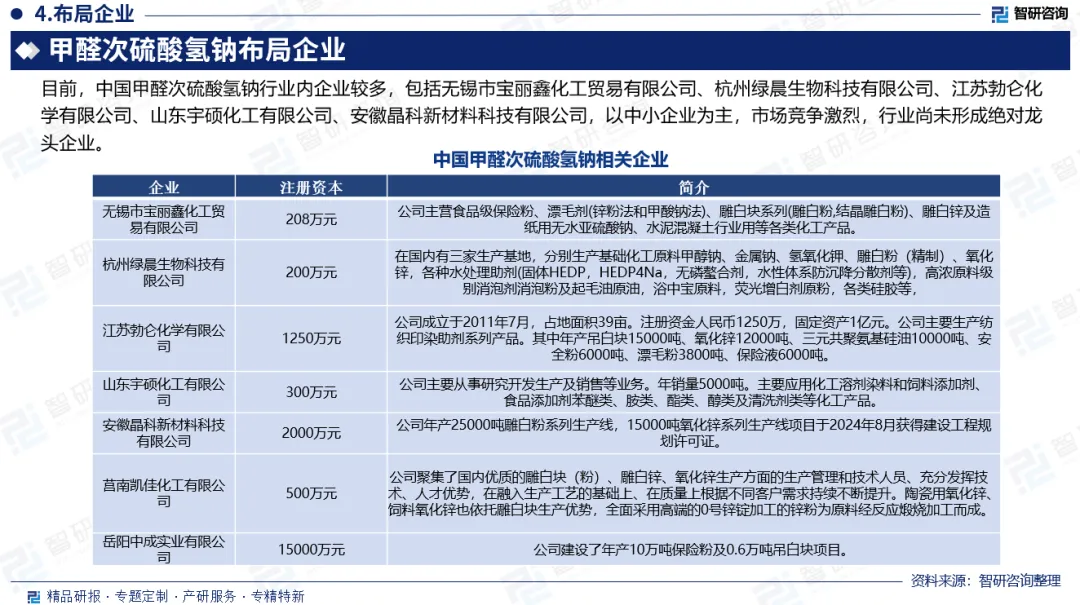 布局企业:目前,中国甲醛次硫酸氢钠行业内企业较多,包括无锡市宝丽鑫化工贸易有限公司、杭州绿晨生物科技有限公司、江苏勃仑化学有限公司、山东宇硕化工有限公司、安徽晶科新材料科技有限公司,以中小企业为主,市场竞争激烈,行业尚未形成绝对龙头企业。