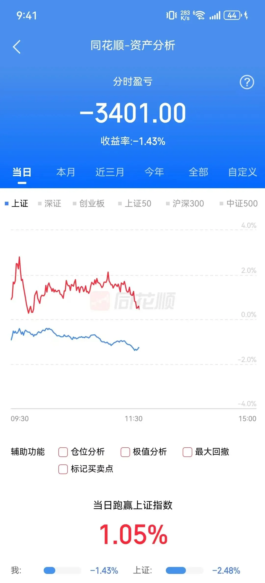 今日账户从+3%到-1.43%。指数走势已经严重不符合我的市场预判了,这种情况发生后,我明白,要降低仓位应对了。看错一定要认错,千万不要死扛,那种亏钱死扛得人,我告诉你们,牛市结束清算,加杠杆的那波人跳楼后就轮到你们了。