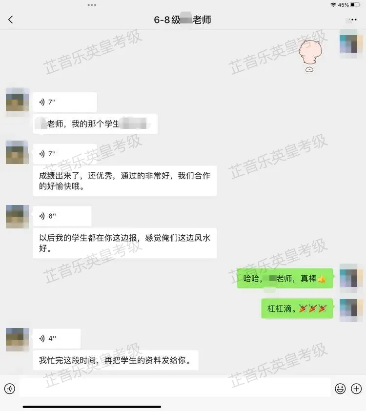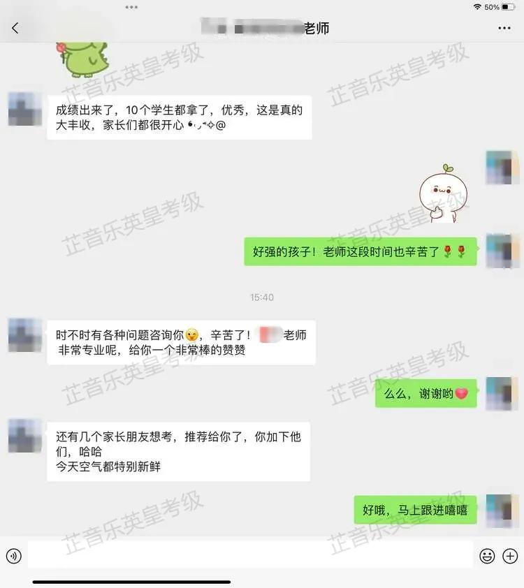 “现在,我们中心的许多学生都在学习英皇考级,成绩也非常好。芷音乐不仅有着丰富的经验,更具备强烈的责任心,每一个细节都处理得非常周到,值得信赖的报名中心。”