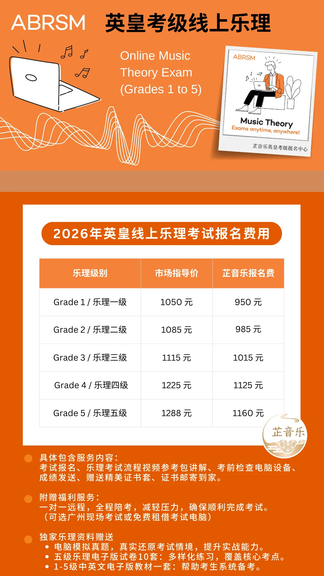 考试报名、远程电脑检查服务、考试流程讲解视频、一对一考试当天远程带考、成绩发送、赠送精美证书套、证书邮寄到家。哪怕是电脑小白的家长或者音乐教师都能确保考生在家也能顺利完成考试。报名可免费享受服务👉:英皇乐理线上远程技术服务——解决你在考试前后的电脑技术难题