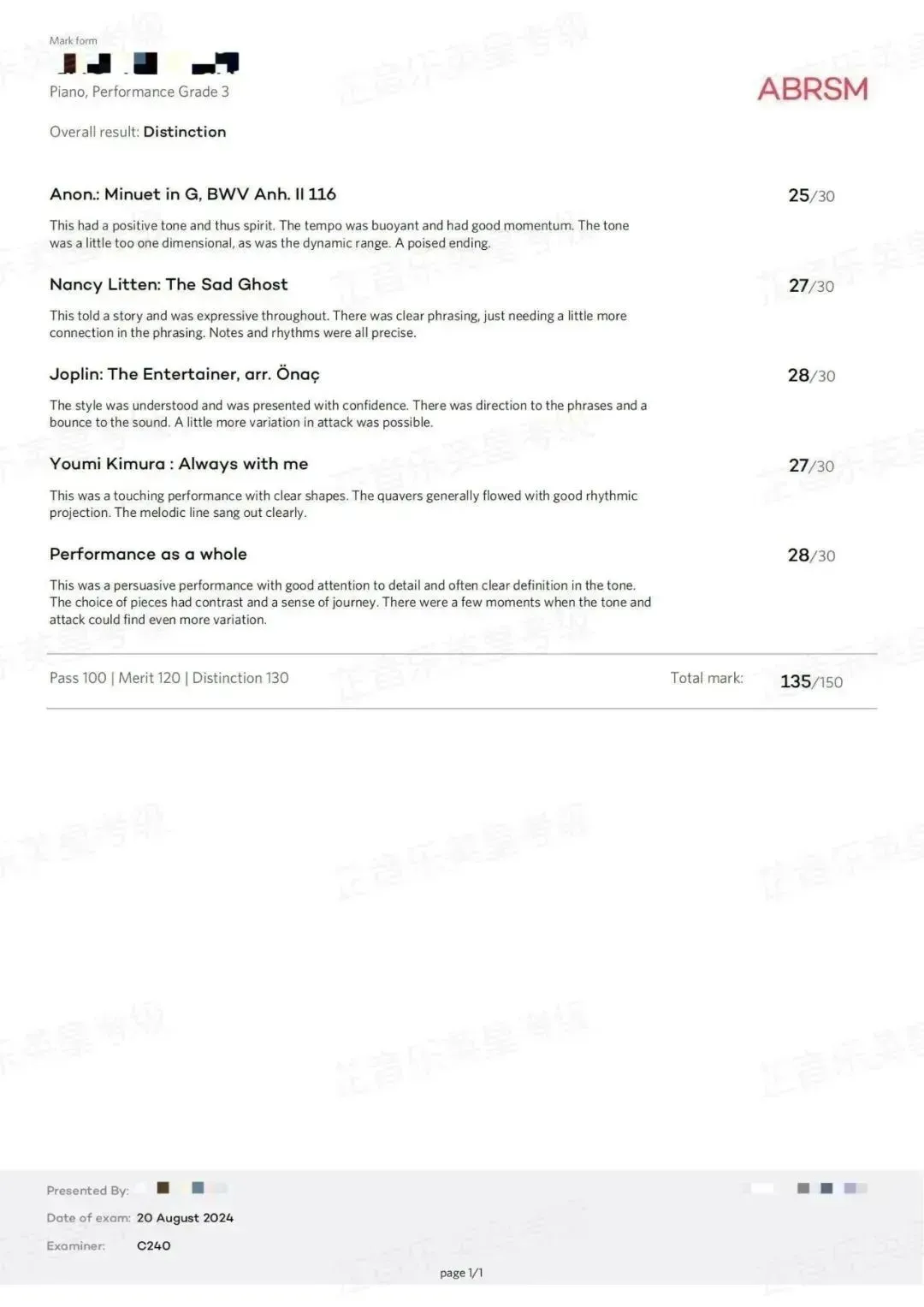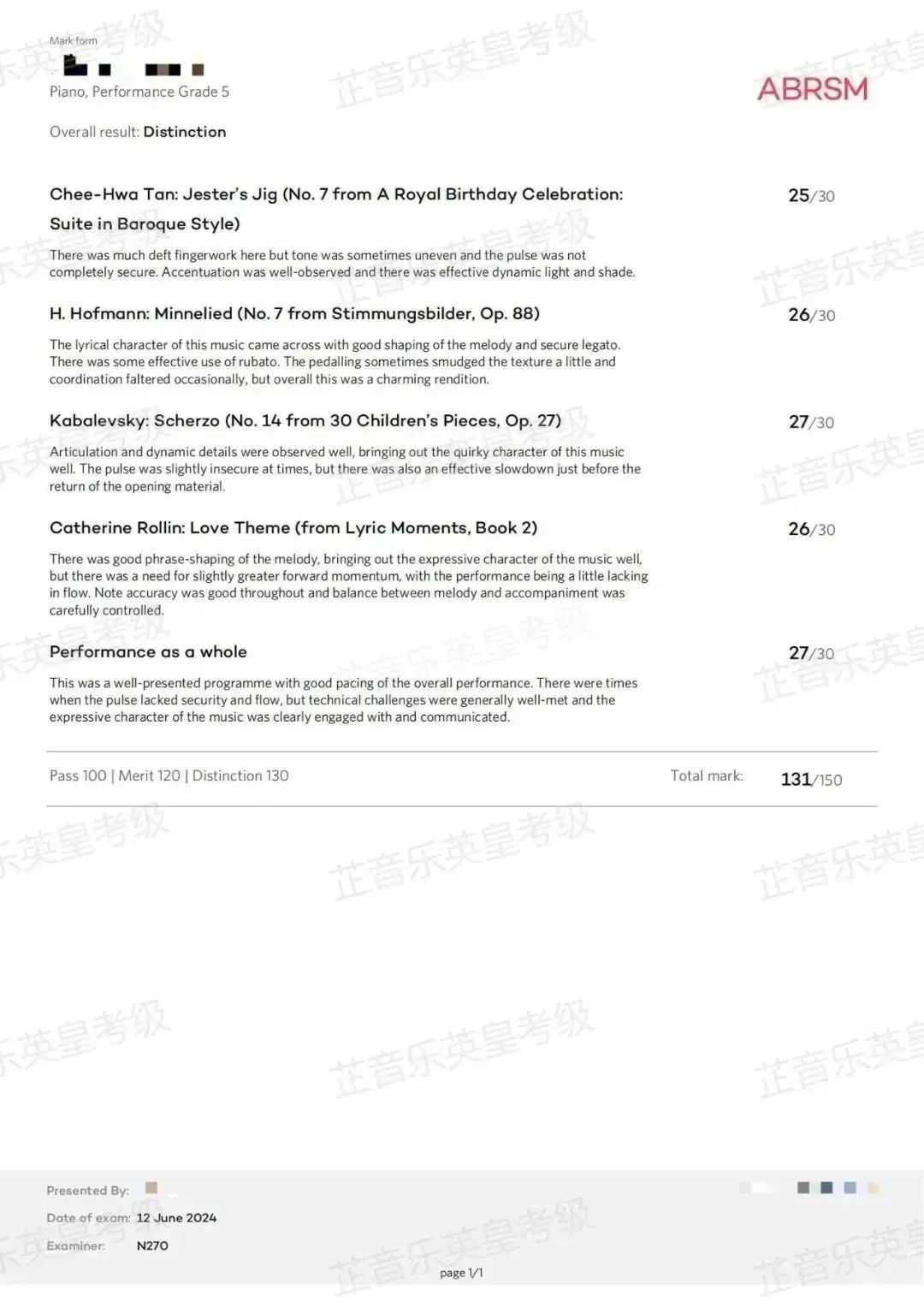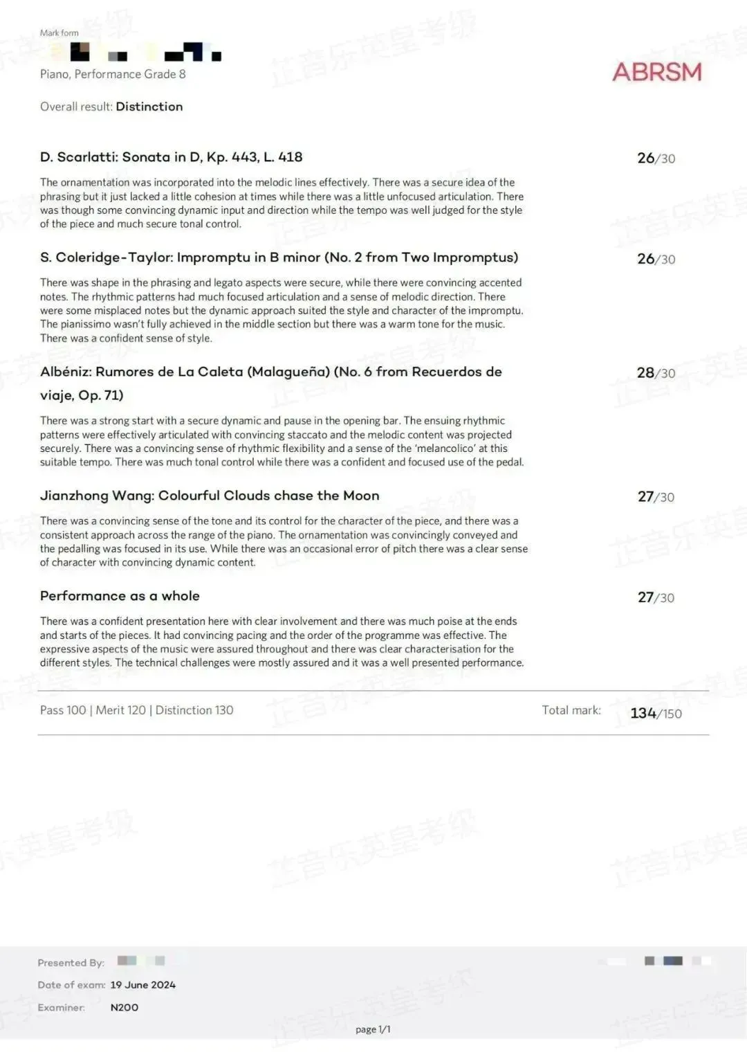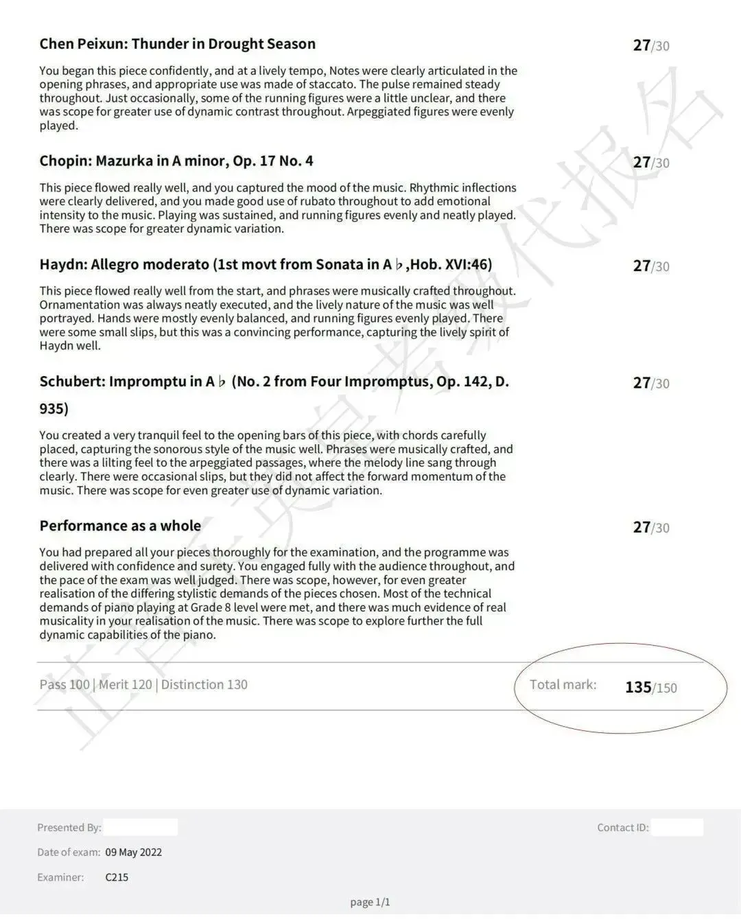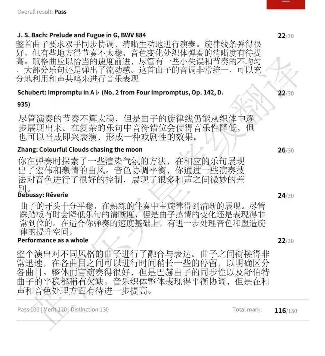 “我的孩子这次英皇考级拿到了高分,真的很感谢这个平台的支持。特别是在视频审核和一对一指导上,帮助很大。” ——考生