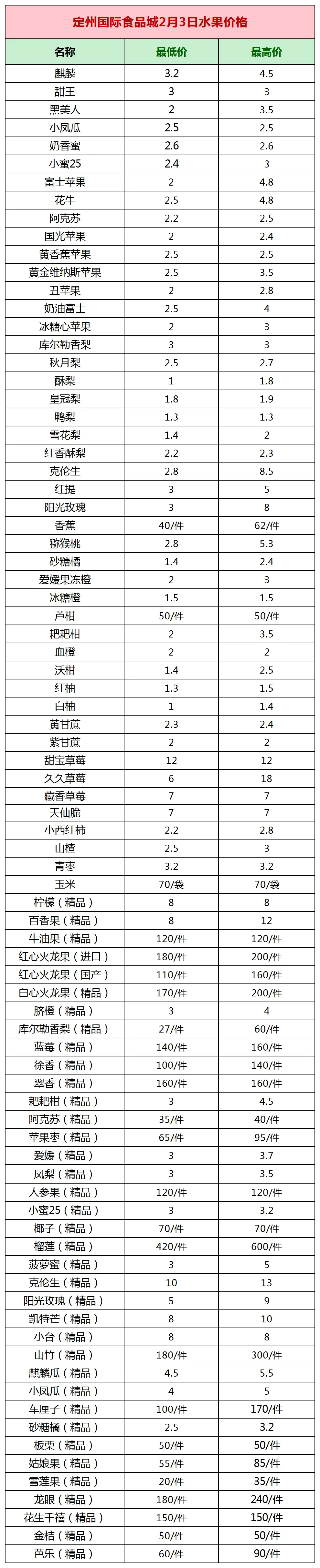 【民以食为天,365天,天天无淡季。为方便广大商户进货采买,获取最新蔬果信息,此微信号每日为您提供定州国际食品城蔬果行情。以下果蔬价格数据计量单位均为元/斤!果蔬价格行情波动比较频繁,请以实际购买单价为准!】
