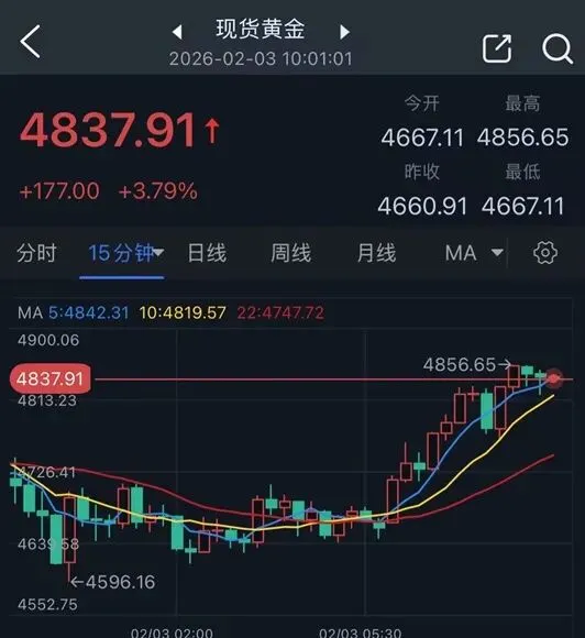 现货黄金目前位于4838美元/盎司附近;稍早金价一度触及4856.65美元/盎司,日内暴涨近196美元。金价此前在上一交易日下跌近5%,延续了上周五的跌势,而上周五的跌幅为十余年来最大。