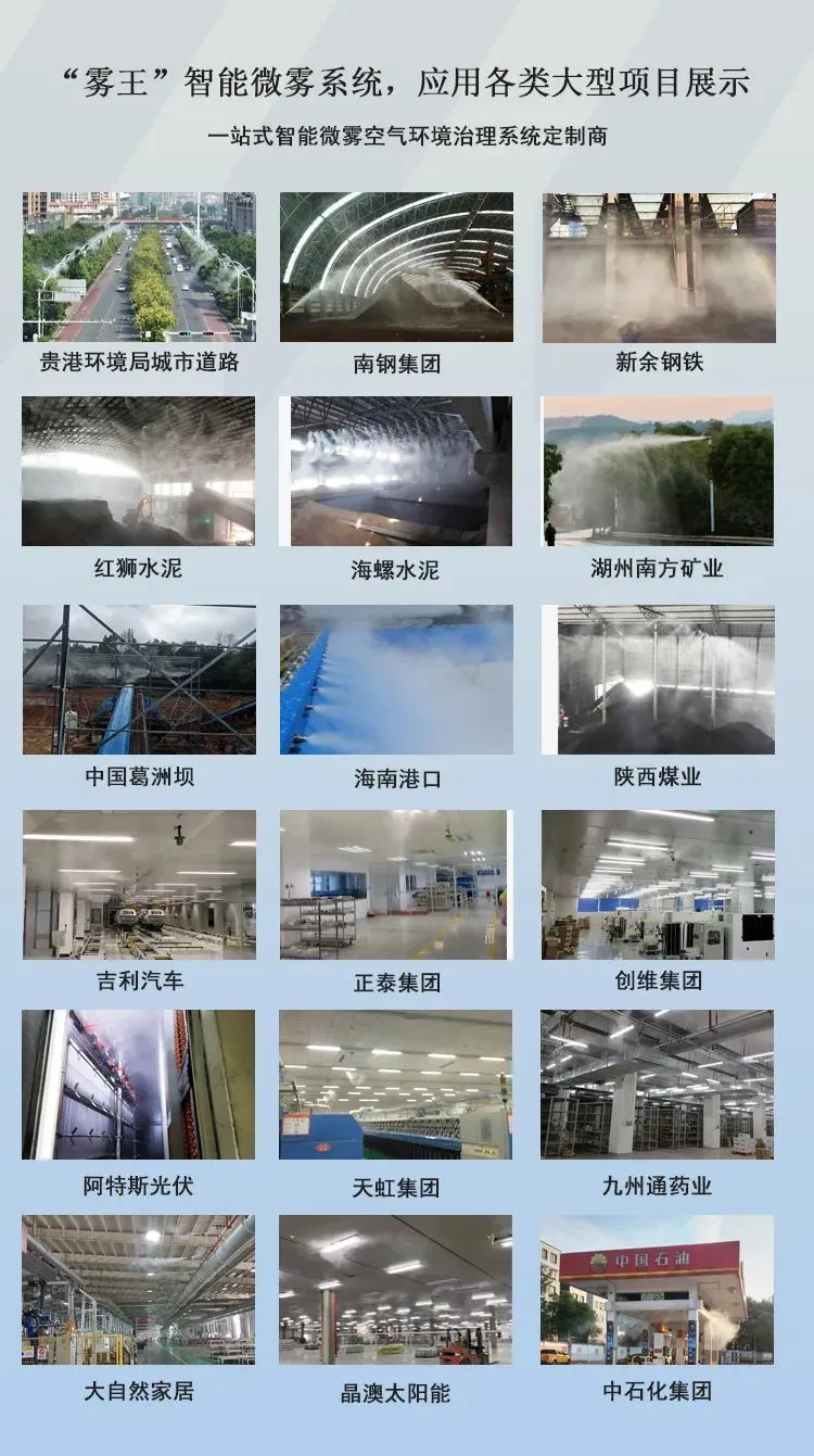 杭州嘉友实业有限公司以成为智能微雾空气环境治理系统第一品牌为愿景,以改善人类健康环境为使命,是国家高新技术企业,是一家集研发、生产、销售安装为一体的低能耗、节能型空气环境治理系统服务商,深耕智能微雾空气环境治理系统领域20年,自创立以来,始终以高标准严格要求自我,专注智能微雾空气环境治理系统的研发与创新,现拥30余项各类核心发明及技术专利,及3项计算机软件著作权,凭借较高专业化水平、较强创新能力,获得“创新型中小企业”荣誉证书、3A信用等级证书、ISO9001质量管理体系认证书、环境管理体系认证证书。公司旗下包含两大系统:智能微雾空气环境治理系统、节能通风降温系统,其中智能微雾空气环境治理系统包含产品:智能微雾降尘系统、节能工业加湿系统、喷雾除臭消毒系统、景观雾系统、喷雾降温系统。节能通风降温系统包含产品:工业省电空调、工业大吊扇、蒸发式冷气机、负压排热风机、降温湿帘。雾王品牌道路路灯杆喷雾降尘系统在湖州矿业、南浔区政府、南浔城投、南京玄武湖隧道口等项目中得到广泛应用,公司与多家大型集团企业保持长期合作关系,包括:中国华电集团、南钢股份、新余钢铁、中原特钢、河北钢铁集团、华远煤业、陕西煤业、南方水泥、海螺水泥、红狮水泥、三棵树、光明铁道、方大研发、中国葛洲坝、中四电子科技、中国石化、中国中铁、吉利汽车、正泰集团、德力西电器、云南建投、中国铁塔、太原武宿机场等大型集团公司。目前公司拥有一批经验丰富的从业十年以上的施工团队,在工程设计上全部按照科学的数据和多年来的工程经验相结合,针对不同环境场所进行合理规划分析,在施工过程中进行科学规范的把控管理。嘉友人用敬畏心,认真对待我们所施工项目的每一颗螺丝钉,确保每一个项目中的系统集成智能化长久稳定的运行。