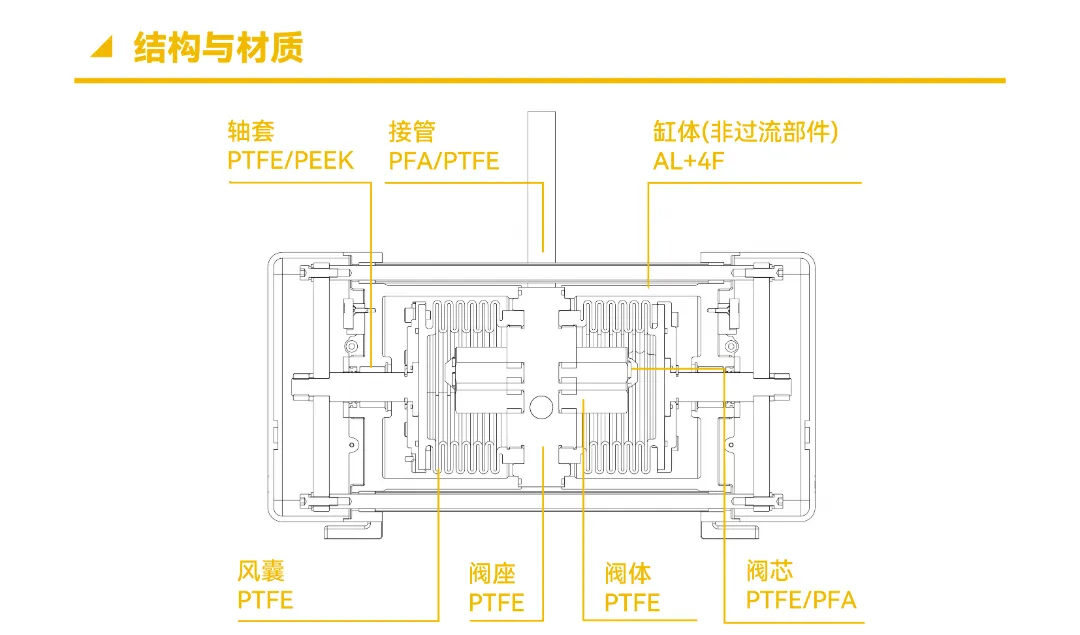 泵的结构包括轴套、接管、缸体、风囊、阀座、阀体、阀芯等部件。轴套采用PTFE/PEEK,耐磨损且密封性好;接管用PFA/PTFE(如三氟莱PFA管、PTFE管等),耐腐蚀;缸体(非过流部件)为AL+4F,轻便且防腐蚀;风囊、阀座、阀体均用PTFE,确保与液体接触部分的洁净;阀芯用PTFE/PFA,兼顾耐腐蚀与密封。这些部件的设计确保泵在长期使用中保持高洁净度和可靠性。