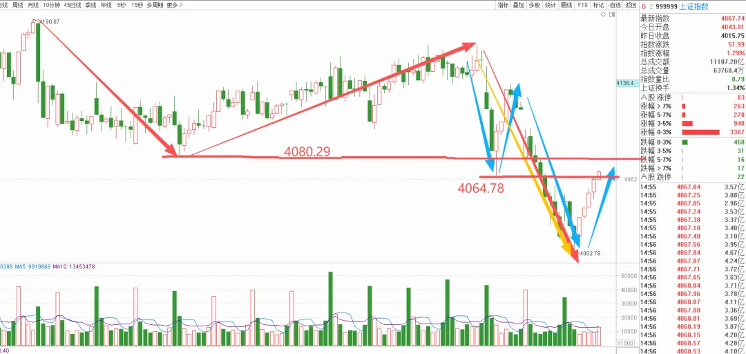 技术面:今天这根带着下引线的阳线,给很多人搞不明白了。那么我们今天就通过技术面分析,告诉大家接下去的应对该如何。今天早盘在高开回调之后,我提示不割也不加。原因很简单,要看成交量,破位,下跌,到颈线位附近,但是没有加仓的资金进去。那么反弹的延续性也要打折扣。今天走的非常的强势了已经,很多人不明白,其实不用纠结,我也认为今天大概率会收十字星,没想到收成光头线,而且收复了非常重要的位置,改变了结构,这里的底层逻辑其实很简单,这个位置,大家割不动,也没钱买,所以预期是一致的,那么对我们操作而言,就是很好的做t的机会,有灵性的,早盘回调买一些,反弹了,本仓位卖出。有些人做减法的也很理智,在有色半导体反弹了,之前套牢盘,减仓一部分,我觉得都没有任何的问题,符合我们大趋势减法的方针,我们不会因为一根阳线而改变什么,为什么?第一,先看k线,我用的是30分钟级别的线,那么很清楚可以看到,目前就是一个大30分钟级别的b段下跌,也可以说是小日线级别的都可以,总之在破掉4080这个位置了,趋势就是从震荡变成了下跌,而且是大趋势的下跌。这个是我们接下去依然要考虑做减法的核心逻辑,君子不立危墙之下,为什么要在下跌趋势里面去加仓呢?没有道理的。第二,可以看蓝色的线,这是5分钟级别的走势,那么很清楚5分钟级别我昨天说了,跌到b段,30分钟b段,日线b段,大中小级别叠加所以出现了b中b的下跌走势,这样的情况我们在技术课的时候讲的明明白白,要回避,因为叠加下跌往往是暴跌,急跌,单边下跌。那么今天这个趋势改变了吗?我早盘提示了一个点位,叫做4064位置,这个位置很关键,我们在讲缠论级别的时候,怎么去判断,一个是时间,一个就是空间。时间同一级别了,就可以计算在一起,但是时间不够空间够了,也同样是一个级别,那么这个4064位置怎么来的?就是5分钟级别b段下跌的起点,所以,这个位置非常关键,一旦回收,那么5分钟级别的趋势就改变了。那么从时间来看,前天a段反弹23根k线,早盘结束我说了,已经确认5分钟级别b段下跌完成了,因为已经反弹了23根左右,但是下午他延续反弹,那么就要看4064这个位置了,如果站不上去,那么我们就等待背驰的买点信号,如果站上去了,那么他就进入了30分钟级别的震荡,而不是5分钟级别的c段或者b中枢了。简单说就是级别扩大了,那么我们从原来等待买入,要变成观望,要看他接下去怎么走。第三,再看黄色的线,因为今天回收了4064位置并且收盘站稳,那么确认了5分钟级别的下跌完成,也确认了黄色这一段,也就是30分钟的a段下跌完成,那么接下去会不会跌出b段,亦或者级别继续扩大, 那我们要一步步推演,这里就有两个关键点,一个是4080,这是小日线级别和大30分钟的破位点,这个位置如果明天回收了,那么就从30分钟级别震荡,变成了日线级别的震荡,如果上不去,那么指数或回调回震荡,就要看今天的低点4002位置,如果破掉了,30分钟级别走b段下跌,不破,那么30分钟级别走震荡,震荡的话,就只能用时间换空间。那么操作理解就很简单,趋势没有改变之前,反弹都是做t做减法的方针不变,看盘盯住我说的几个关键点就可以了。不要因为一些反弹,一些回调就不知所措,所有的操作都应该有理有据,市场变化万千,我们能做的就是做好应对。